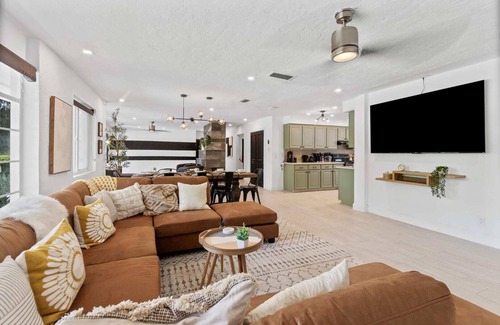Recently remodeled, this home offers a massive open-concept floor plan with a fully equipped chef’s kitchen featuring quartz countertops and black stainless steel appliances. A dining table for 8 and multiple lounge areas make it easy to gather, relax, and enjoy.