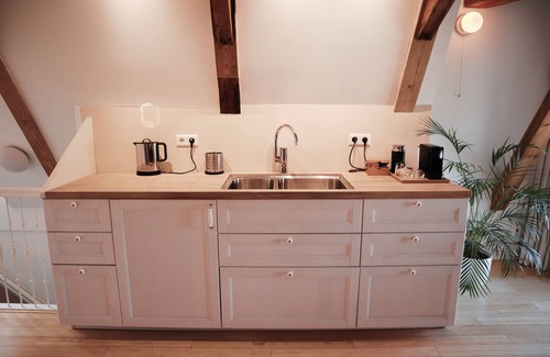 This is an attic apartment in a building that was built around 1732. The wooden beams of the roof construction are clearly visible, which reflects the unique character of this historic building.