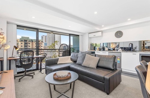 - The living space is both cozy and chic, with a three-seater leather-look lounge, a coffee table, an entertainment unit with games, and a smart TV. A dedicated study nook with a desk, lamp, and chair overlooks the balcony, offering breathtaking views of inner Perth city.