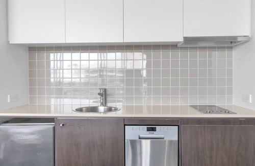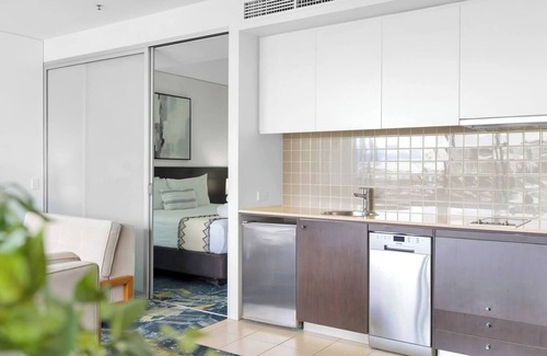 Stepping inside, tropical waterfront views will immediately catch your eye. A seamless open flow extends to a private balcony with seating for two, where you can take in breathtaking vistas of the Cains inlet and city skyline. The apartment features a spacious living area, complete with a kitchenette that includes a dishwasher, ceramic hot plates and a small fridge.