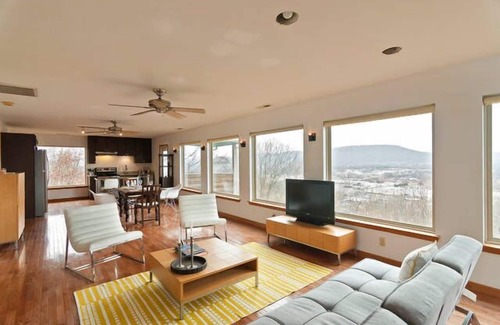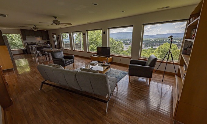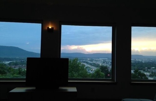 City Overlook is an urban chalet located in the city just above downtown Chattanooga, on a rustic, secluded private 2 acre wooded lot. Parties and events strictly prohibited. This property has immediate access to downtown and interstate (I-24), and is conveniently positioned between downtown and Hamilton Place Mall. The second floor chalet has a unique wall of windows framing views of downtown Chattanooga, Lookout Mnt., and Signal Mnt., and is a bright sunny place to be in the fall and winter. The space has hardwood floors in the living room, gas fireplace, stainless appliances, contemporary décor, private covered balcony in the trees, and approx. 1300 sq. ft of living space, with a fully equipped kitchen. EPB fiber optics wifi. The chalet has two large carpeted bedrooms both with memory foam mattresses, with 400 threat count Egyptian cotton sheets.