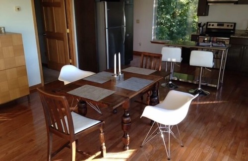 The chalet is located down a long narrow gravel driveway that is a bit rough and can be muddy. The driveway can be difficult to turn around in. The chalet is on a natural wooded lot with minimal grass and landscaping. This location is just above downtown so you may hear noise from the city and traffic in the distance.