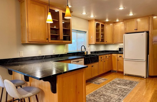 - **Gourmet Kitchen:** Fully equipped with modern appliances, beautiful countertops, and a gas range for the