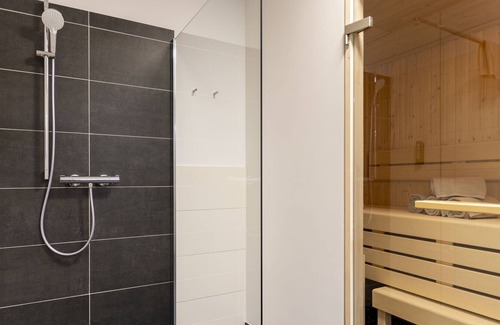 Layout: On the 1st floor: (Living room(double sofa bed, TV), open kitchen(dining table, hob, electric kettle, toaster, cooker, hood, coffee machine, oven, microwave, fridge), bedroom(double bed), bedroom(double bed), bathroom(shower, washbasin, toilet), bathroom(shower, sauna, washbasin, toilet)) balcony or terrace, garden furniture, parking, baby crib(paid)