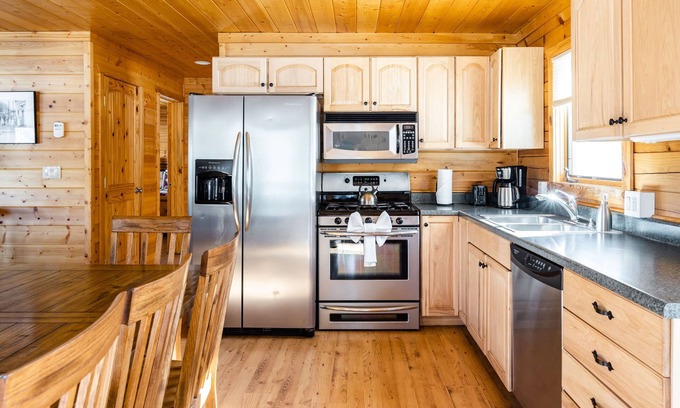 Mountain View is the star of Beyul's cabin lineup. It's really a lodge itself (some might call it a chalet). It's got two stories, 3 spacious bedrooms, a full kitchen and laundry, and best of all, a great room where you can gather around a long dining room or the fireplace. It sleeps 11 in beds and has a wrap-around porch.