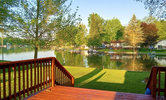 This house is on the Chain-Of-Lakes including Sand Lake, Icehouse Lake, Boathouse Lake, Townline Lake and Haven Lake. Beautiful views of the water can be enjoyed from your private dock, the fire ring in the back lawn, the spacious wrap around deck, or the large windows providing a view from inside. An open concept kitchen, dining, and living area face the water, and open onto the deck. You can enjoy the warmth of the fireplace with the flip of a switch in the cooler months, or capture the summer breeze off the water in the warmer months. Fishing, both winter and summer, is a popular sport, with access to five lakes right out your door. A boat launch is on your way to the property, just a short way down the street. Two kayaks, and a paddle boat are available for you to use, and 4 life vests are provided. Basic summer fishing equipment is also available, along with yard games and a couple of bicycles. Grill out, relax on the deck, and go for a swim. The house is 2 bedroom, 1 bath. There's a queen bed in one room, and a bunk with queen on bottom and twin on top in the other. An air mattress is available for additional sleeping space. Linens, blankets, towels, and laundry facilities are provided. The bathroom is recently updated and is clean and modern. The kitchen is well equipped with dishes, cutlery, utensils, pans, coffee makers, crockpot, toaster, blender, microwave, full size refrigerator, and range. A large smart TV with ROKU and fast WIFI provide additional entertainment and working ability. A folding desk provides a customizable work space - put it wherever you feel like working for the day, even on the deck!