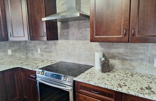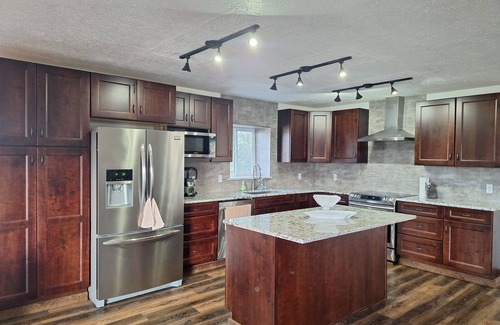 The kitchen is very spacious with an island, bar top, stainless appliances, tons of counter space and everything you need to cook and serve a meal.