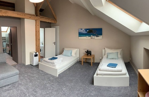 This house is just 8 km from the Geneva airport and minutes from a lovely french village. While there is a full kitchen for cooking, there is also a great pizza restaurant across the street. This unit has been great for business groups and work crews coming to Geneva as well as families. No large parties allowed.