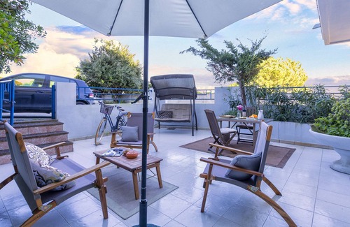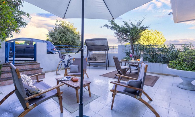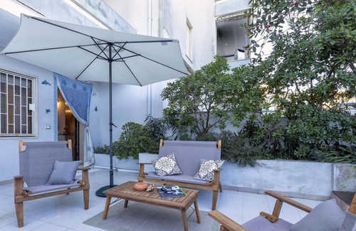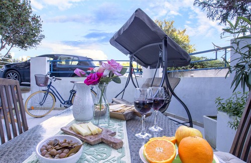The apartment is located on the ground floor in a typical Alghero building near the beach and has an internal living area of 70 square meters and has a large outdoor area furnished with sofas, umbrella, chairs, table and swing.