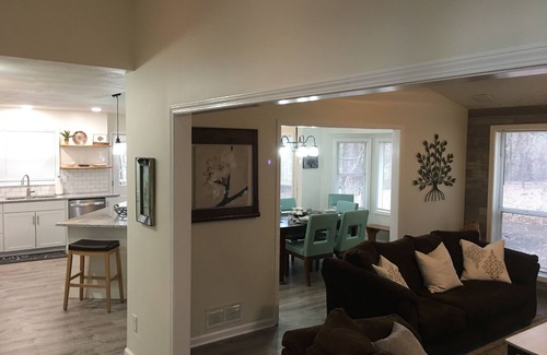 A hidden gem,tucked away in the forest,at the end of a tree lined drive.There's 2 great decks.One for your morning coffee and quiet.A second deck with a gas grill and dining set for those sunset meals.Inside you'll find an all new open kitchen,dining,and sitting area.There's a comfy living room with fireplace.The bedrooms are spacious with all new bathrooms.