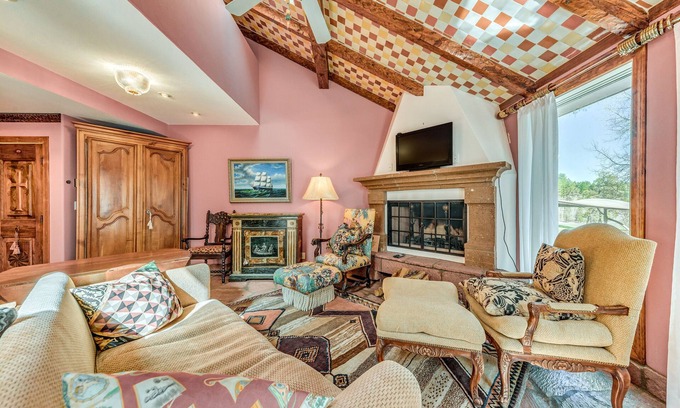 Book this Cloudcroft vacation rental for an outdoor retreat that will have you staying in style! Every piece of this 2-bed, 2.5-bath property weaves together to tell a story, from the hand-carved animal decorations and wooden doors to its eclectic mélange of patterns, textures, and colors. Plus, you’ll be within 4 miles of the area’s top sights, like Ski Cloudcroft and Lincoln National Forest. After your adventures, cozy up beside the wood-burning fireplace or dine al fresco on the balcony.