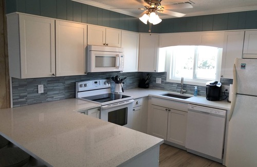 Condo is well-kept and very clean! Master suite is equipped with a king bed, en suite bathroom and flat screen TV. The second bedroom has two double beds, flat screen TV and a full bathroom in the hallway. An additional flat screen TV is located in the living room. There is seating for 6 in the dining area and 4 stools for dining at the kitchen counter. The newly remodeled kitchen is generously stocked with all the high quality necessities to create your meals at the beach. There is also a washer & dryer in the condo. The condo complex also has an outdoor shower for rinsing off the sand from your time at the beach. To be able to stay connected to everyday life, wireless internet is available, as well as TV and other media streaming.