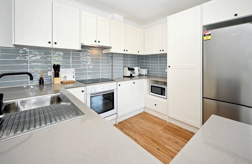 The kitchen is brand new and has all new cabinetry and appliances. With cook top, fridge, microwave, oven, pots, pans, cutlery and crockery, it is ready for you to cook up a feast, should you wish.