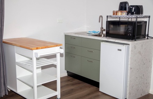 There is a small kitchenette with a microwave, mini fridge, airfryer, toaster, and kettle.