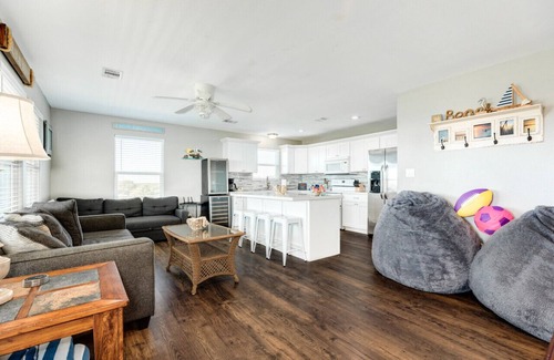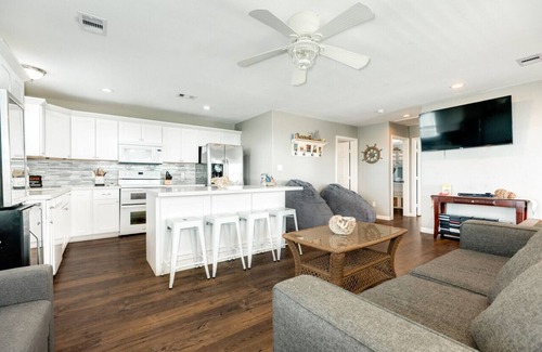 Welcome to our serene retreat, where the spacious open-concept living area seamlessly blends comfort and style, featuring two plush sofas and a large flat-screen TV for your entertainment. The kitchen, equipped with ample counter space and a four-seater island, invites both cooking and conversation. This cozy haven includes one full bathroom, two half baths, a bunk room, and another bedroom, each outfitted with smart TVs for your relaxation. Step outside to enjoy the fresh air on the top front patio, complete with outdoor seating, or unwind in the hammocks on the bottom patio, offering panoramic views that surround the home.