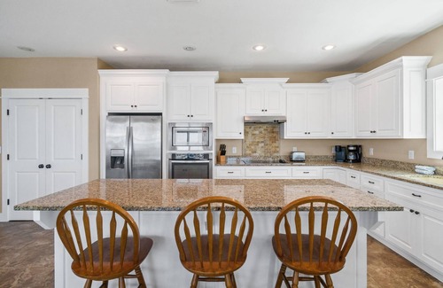 The fully equipped kitchen features sleek granite countertops, stainless steel appliances, and a walk-in pantry, ready for everything from pancake breakfasts to big family dinners. The dining table seats ten with additional room at the island, so everyone can come together around the table.