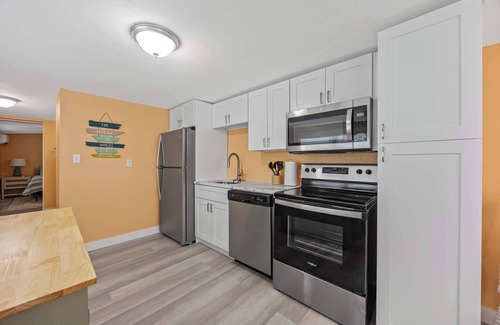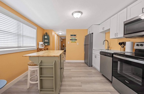 Inside, you’ll find a thoughtfully designed space with all the essentials you need for a relaxing vacation. The bedroom offers a peaceful place to rest after a day in the sun, while the living area and kitchen provide a comfortable setup for meals or winding down. Outside, guests are welcome to enjoy the shared backyard area—perfect for morning coffee, reading in the shade, or gathering after a beach day. With restaurants, shops, and local attractions close by, this unit puts you right in the center of Cocoa Beach’s fun, beachy vibe.