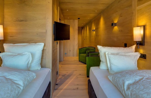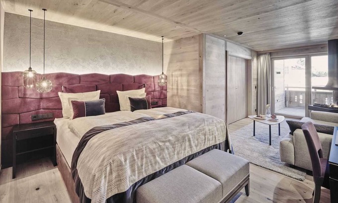 Natural materials such as old oak, fine fabrics and modern design elements are skilfully staged. Innovative style elements and a harmonious design convey alpine exclusivity in a cozy setting. Right in the middle: your personal private spa with Finnish sauna with infrared wellness radiation. The crackling fire in the romantic hanging oven (show oven) underlines the feeling of calm and security that makes your suite your personal place of strength and living an unforgettable experience. Exclusive bathroom with free-standing bathtub, walk-in shower, extra toilet & bidet, minibar with free non-alcoholic drinks, espresso machine, TV, terrace, closet space, another bedroom with a double bed.Please note that the pictures and the room sketch are only sample pictures and the appearance of the actual category may differ.