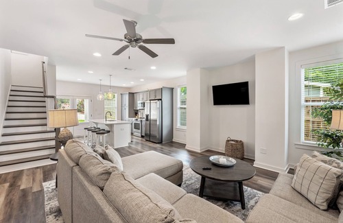 Grand 5 bedroom and 5.5 bath house in a secure, quiet setting close to everything. This fabulous house is a wonderful open concept kitchen and living room is wonderful for visiting with your family and friends while in the Loveliest Village for the many attractions that bring us back! Sectional sofa is comfortable and great for watching highlights after the big win. Spacious porches and balconies are wonderful for getting out of the sun and enjoying each other's company. The back yard has 6 parking spaces and a lit grass courtyard that is beautiful. Sister house on College is connected through the backyard and perfect for large parties that need two houses.