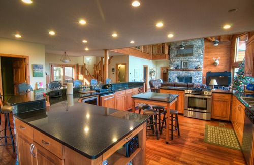 The great room has 20+ foot ceilings with open beams, a 53” fireplace and magnificent views of the 700' waterfall. The gourmet kitchen has plenty of workspace.