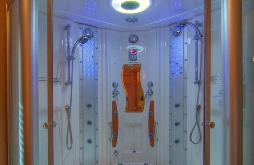 The lodge has 5 spacious bedrooms with 4 1/2 baths. The master bedroom has a spa shower with 6 massaging shower heads and also an infrared sauna with room for four. The Lodge has 4 King size beds, 1 Queen sofa bed, 3 trundles with twin mattresses, a queen futon and 2 inflatable Queen air mattresses. The lodge also has a portable 'pack and play crib and 2 high chairs available for use.