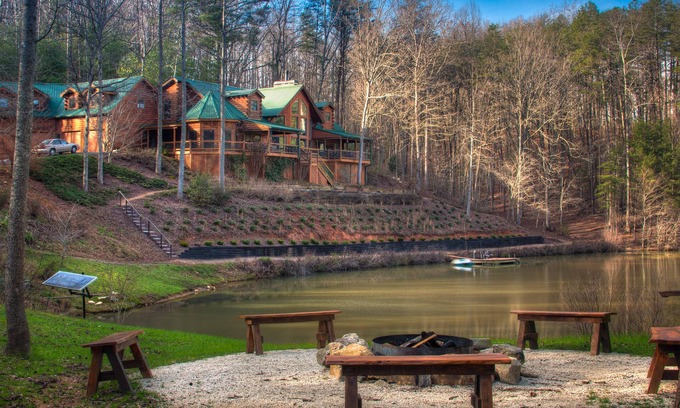 Bear Ridge Lodge is appraised at 4+ million dollars. Nestled in the beautiful North Georgia Mountains, the home is located only two miles from the spectacular Amicalola Falls, which is the largest water falls east of the Mississippi and cascades over 700’. This luxury cabin home located at 1800' elevation on 25 acres of secluded forests is the ultimate setting for your next family vacation, corporate event or romantic get-away. The lodge has everything from a fully stocked lake loaded with Bass and Bream (catch & Release only, canoe, pedal boat, hiking trails, WIFI open broadband Internet, a championship pool table and a 75” HD TV with satellite.