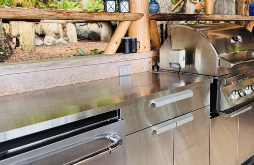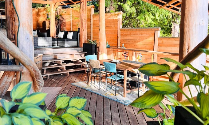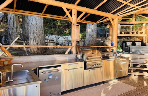 Taking the stairs up the hillside you begin to see the beautiful log work that make up most of this stunning retreat. At the top it opens up to a large outdoor covered living space, a lounge area with propane fire pit, dining area, and out door kitchen containing BBQ, mini fridge, sink, cook top, microwave, Insta pot, mini oven/air fryer and toaster. All open concept with the forest behind you and full frontal views of the ocean.