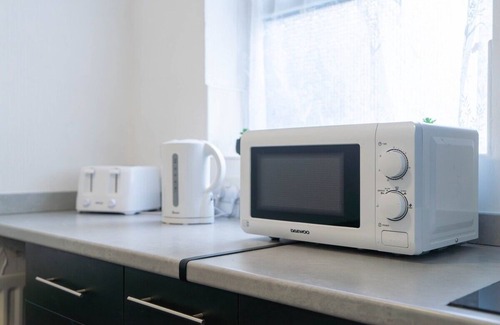 The well-equipped kitchen includes an oven, microwave, and toaster.