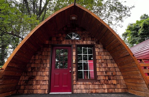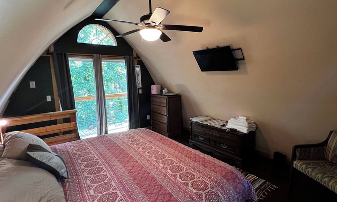 1/2 mile from TIEC. King quality AIR BED, air conditioned. Communal Fire pit. Our upper level cabins will give you the feeling of being in the trees. You will have SHARED use of 4 bathrooms and kitchenettes. Snacks will be in your room. On this level, you will have access to your private balcony and shared use of our lighted tree house deck to watch the moon and the stars!