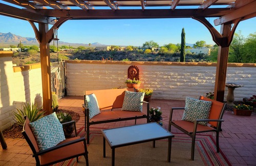 Enjoy the beautiful, unobstructed view of the Santa Rita Mountains from the spacious, quiet, backyard patio. The patio comes equipped with a gas barbecue, pergola with sunshades and comfortable furniture to enjoy the sunny weather and sunset views. Our townhouse is located within walking distance of the Desert Hills Social Center (swimming, tennis, workout room, sauna, classes, hot tub, etc.). Enjoy walking through the nearby arroyo with maintained trails.