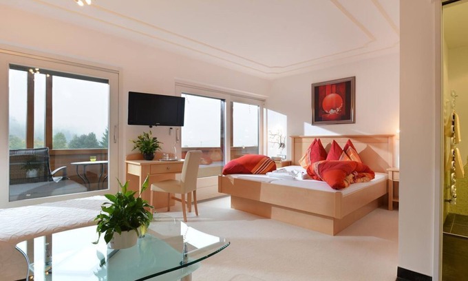 Our feel-good rooms - with the names of the mountain peaks all have their own atmosphere thanks to different color concepts and furniture. Our very quiet rooms are all non-smoking and have a balcony, shower, toilet, hairdryer, tilting TV, a sofa and a small desk with internet access. The natural-colored bathrooms have walk-in entry into the shower and plenty of storage space. Bathrobes are available free of charge.
