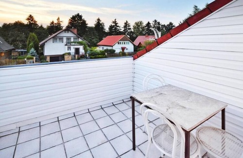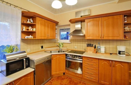 This spacious, two-story holiday home sits on a private, fenced property and accommodates families comfortably. The ground floor features a living room with fireplace, TV, dining table, a fully equipped kitchen, three bedrooms, a bathroom with shower, and an extra toilet. Upstairs, there are three more bedrooms and a second bathroom with a bathtub and washing machine. Outside, guests can enjoy a large terrace with deckchairs, garden furniture, parasol, and barbecue. A small playground and parking are available on the property. The owners provide a free rowing boat for lake excursions, and bikes can be rented for a small fee. The stay includes bed linen, towels, utilities, cot, parking, and one dog. Ińsko’s scenic surroundings offer hiking and cycling trails, medieval town remnants, and an observation tower overlooking the lake, making it perfect for both relaxation and outdoor activities.