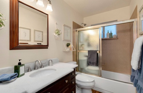 This welcome retreat is completely furnished inside and out. Both upper level and lower level living rooms leave plenty of space to spread out or enjoy conversation with guests! We have 4 extremely comfortable bedrooms. Upper level boasts 1 King bedroom and 1 Queen bedroom, Bathroom has shower and bath combination, plenty of counter space around the quartz sink and medicine cabinet in mirror.