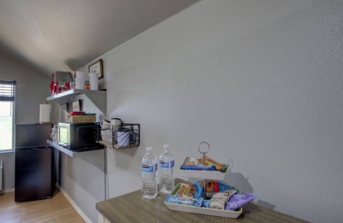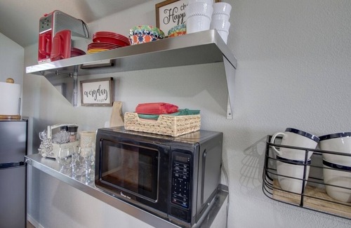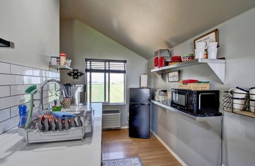 Beautiful apartment above a detached shop. Small but mighty in amenities. No actual kitchen but there is a sink area, dishes and silverware, microwave, refrigerator, toaster, blender, coffee Keurig. Outdoor gazebo for enjoying the outdoors. Washer, dryer combo guests can use upon request. Good freeway access and great access to Meridian and Kuna.
