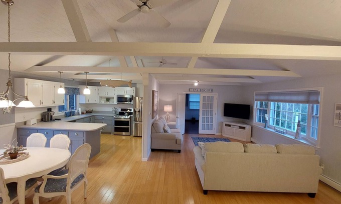 Living room with couch, loveseat and flat screen smart TV leads you through French doors into cozy family room with wingback chairs facing the fireplace. Family room also has two queen futons and table with games, puzzles and books. One minute walk to pond access where yo can go fishing and paddleboarding. Approximately 5 minute drive to North & South side beaches, restaurants, shopping and antiquing! Short drive to many attractions including Golf, Fishing, Mini Golf, Go Carts, Batting Cages, Arcade, Kayak rentals, Inflatable & Water Park and much more.