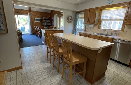 The well-equipped kitchen has ample counter, cabinet, and pantry space, a spacious island, and is very well stocked with everything you will need for your stay. The dining room table has seating for 8 and opens onto the screened porch which has a picnic table for 6 - 8, plus extra seating. There are also 3 bar stools at the island in the kitchen.