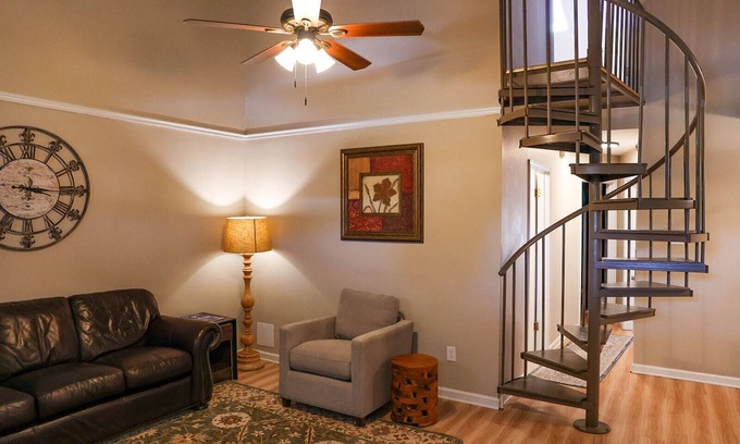 Cozy but spacious rooms and living area with warm colors and comfortable beds. Smart TV’s in bedrooms and living area. One bath downstairs has tub/shower combo as well as washer and dryer (laundry detergent and dryer sheets provided). Workspace located in the loft, along with another TV and Game Cube. Upstairs has a second bathroom with lots of counter space and shower.