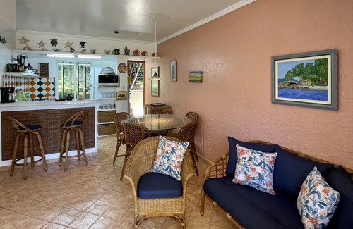 Cozy, the property, features Air Conditioning, ceiling fans in living room and bedroom, satellite TV, clothes dryer, kitchen utensils, toaster, blender, microwave, stove, refrigerator and dehumidifier (which must be kept off during the stay).