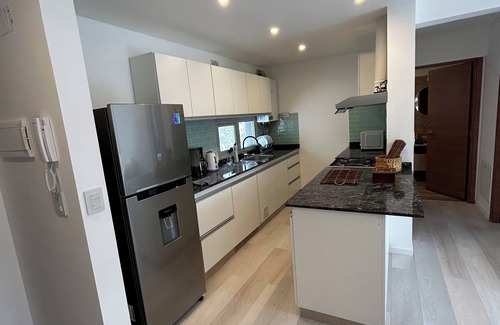 El departamento está calefaccionado con losa radiante y tiene aire acondicionado. En la zona de cocina encontrarás pava eléctrica, cafetera, microondas, cocina con horno y todos los utensilios necesarios; además de despensa de bienvenida con azúcar, sal, aceite, aceto y sobres de té.