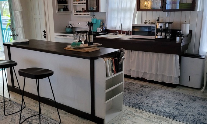 Two bedrooms, one bath, stocked kitchen with: microwave, air fryer, blender, inside kitchen grill, espresso machine, coffee maker, stand alone ice maker, and plenty of cooking utensils to make your own delicious dinners with local fresh seafood from markets just right down the road. Or catch your own to cook! Less than a mile from public boat ramp.