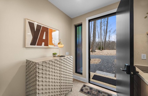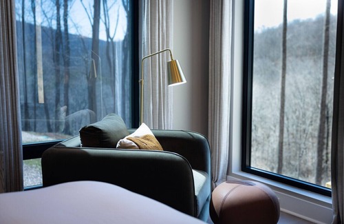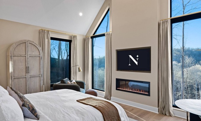Beautiful 55 acre Tennessee mountainside property featuring eight 500 square foot Nature Suite™ carefully designed for comfort, with a full kitchen, king bed, dinette set with seating for two, 55" smart tv, 50" linear fireplace, spa like bathroom appointed in Italian porcelain tile, Rain shower and Handheld shower.