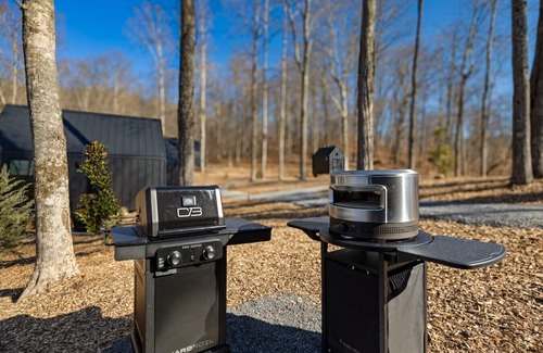 Expansive patio with hot tub, grill, pizza oven, Solo Stove smokeless fire pit, heated chairs and hammock.