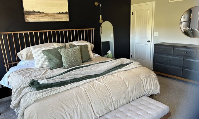 Two additional bedrooms on the main floor cater to different group needs. The first features a queen-size bed with plush linens, offering a peaceful and quiet space to unwind. The second bedroom is a bit more unique—featuring a twin-over-king bunk bed. This arrangement is perfect for families with children, offering flexibility and comfort for a variety of guests. With these three main-floor bedrooms, there’s ample room for everyone to sleep comfortably, whether you're traveling as a couple, family, or friends.