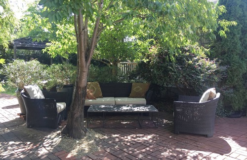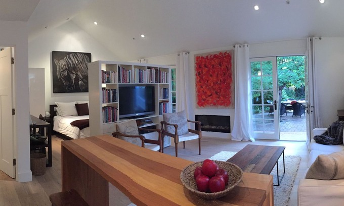 Luxurious 500sft Contemporary Cottage with French Doors opening onto the landscaped garden with sitting area, Kitchenette, sky-lighted stone shower, Living Room& Pilates Studio 3 blocks from the Plaza perfect home away from home. Makes this your personal sanctuary whether you are staying for the weekend or for the whole month while looking for the perfect home to buy. Well appointed, decorated with international contemporary art with just enough touches that take you beyond the hotel luxury suite. A great modern getaway with Garden, al fresco dining with BBQ, garden lounge area and fully equipped Pilates Studio.