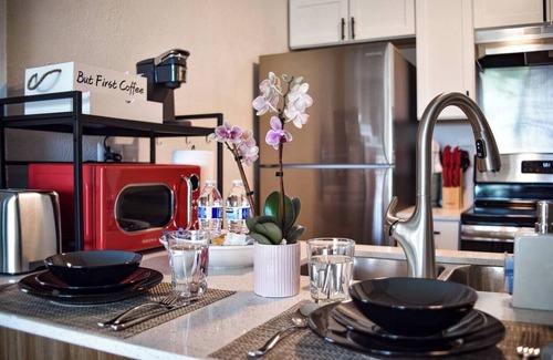 Come enjoy this private apartment with stainless appliances, quartz countertop, new furniture, blender, plates, glasses, hairdryer, and disposable toothbrush should you forget to pack yours!