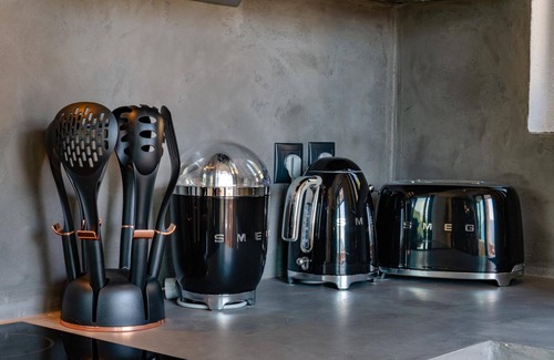 Indicative of the owner’s artistic use of colour, the striking pinkish hue of the house façade contrasts markedly with the muted greys of the living area and whitewashed, part-exposed/part-polished concrete minimalism of various walls in the kitchen, bedrooms and bathrooms. Further highlights that teasingly reveal themselves as you move through the property include a vaulted beamed ceiling in the living room; large picture window and tall sliding doors framing the splendid view; dramatic and impactful artwork alongside smaller, more subtly decorative pieces as well as an inviting wrap-around terrace cum dining area.