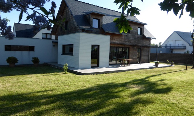 In the calm of a dead end overlooking the beach of Lanséria, our contemporary wooden house with a large terrace to the South, protected from the prevailing winds and an enclosed garden, will offer you a beautiful living room always very clear and a family kitchen, 2 bedrooms with double bed and two bedrooms with single beds (x2 and x4 as bunk beds), and three bathrooms and toilets so that everyone can get together without being shy