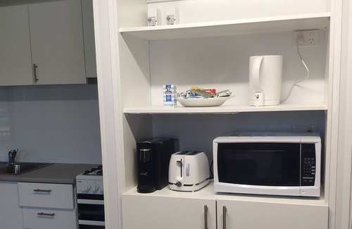 The kitchen is fully equipped and cleverly designed to ensure easy access to all appliances. Guests are provided with ample cutlery, crockery and cookware for use with the cooking appliances (oven, grill, hotplate, microwave, etc). For those staying longer term, you will enjoy the added luxuries of an espresso coffee machine and dishwasher.