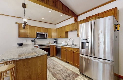 Inside, you'll find a spacious living room equipped with a TV and comfortable seating, perfect for cozy evenings after a day of outdoor fun. The fully stocked kitchen and dining area provide everything you need to prepare delicious meals, whether you're enjoying a casual breakfast or a family dinner. Step outside onto the large deck to soak in the fresh mountain air and beautiful surroundings.