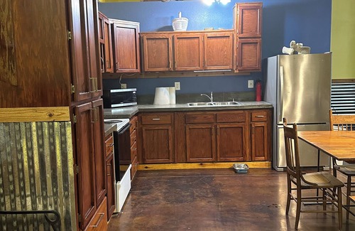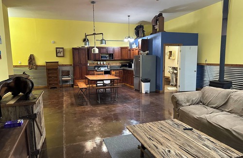 This is a shop barn that was converted into comfortable living. 12 foot ceilings big open floor plan. Comfortable king memory foam bed with a pull out memory foam twin in front room. Full kitchen and bath. Your only close neighbors are horses and goats small little fenced area for your dog or for enjoying sitting and relaxing. The outside of the building looks like a typical farm building you enter for a upscale loft type unit. The sleeping area does not have a door. As this is a farm building. There is no guarantee that there would not be Flys or other insects but we worked very diligently to keep the unit clean and very comfortable. Active working farm.